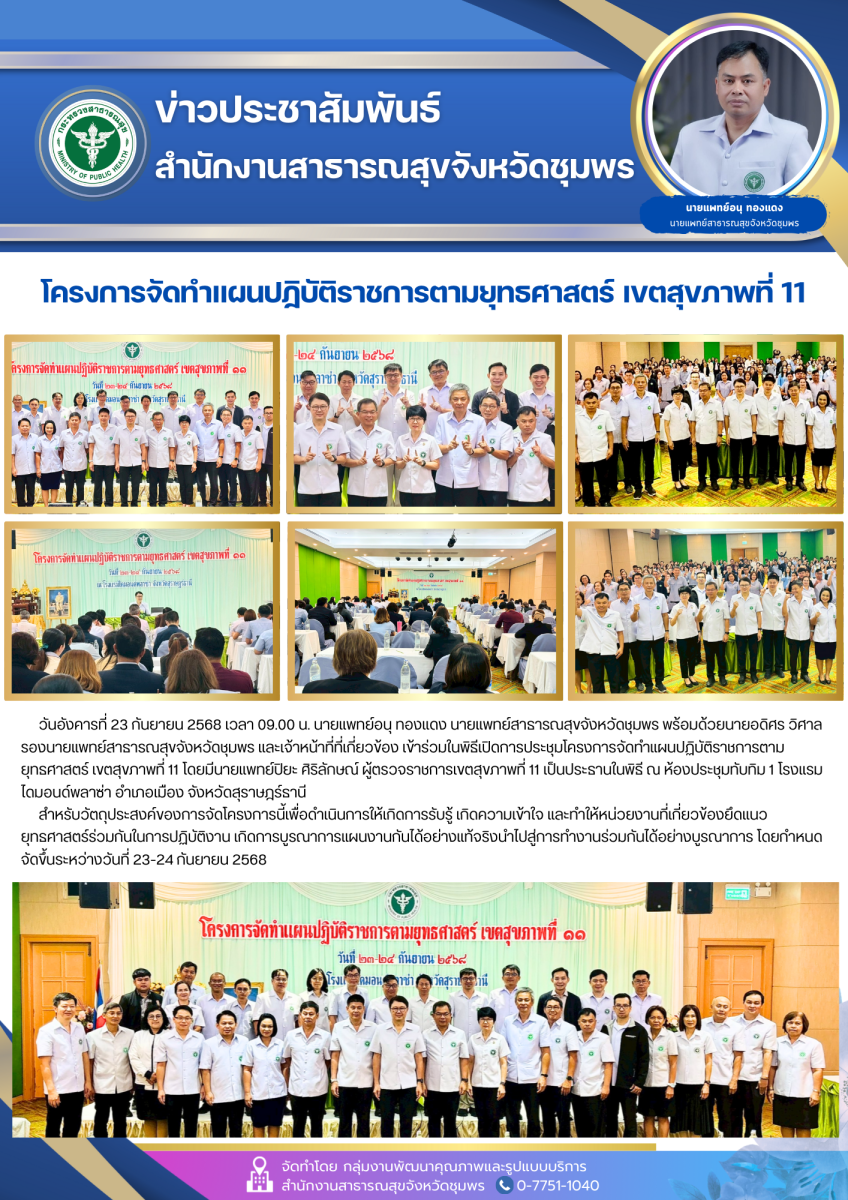 วันอังคารที่ 23 กันยายน 2568 เวลา 09.00 น. นายแพทย์อนุ ทองแดง นายแพทย์สาธารณสุขจังหวัดชุมพร พร้อมด้วยนายอดิศร วิศาล รองนายแพทย์สาธารณสุขจังหวัดชุมพร และเจ้าหน้าที่ที่เกี่ยวข้อง เข้าร่วมในพิธีเปิดการประชุมโครงการจัดทำแผนปฏิบัติราชการตามยุทธศาสตร์ เขตสุขภาพที่ 11 โดยมีนายแพทย์ปิยะ ศิริลักษณ์ ผู้ตรวจราชการเขตสุขภาพที่ 11 เป็นประธานในพิธี ณ ห้องประชุมทับทิม 1 โรงแรมไดมอนด์พลาซ่า อำเภอเมือง จังหวัดสุราษฎร์ธานี สำหรับวัตถุประสงค์ของการจัดโครงการนี้เพื่อดำเนินการให้เกิดการรับรู้ เกิดความเข้าใจ และทำให้หน่วยงานที่เกี่ยวข้องยึดแนวยุทธศาสตร์ร่วมกันในการปฏิบัติงาน เกิดการบูรณาการแผนงานกันได้อย่างแท้จริงนำไปสู่การทำงานร่วมกันได้อย่างบูรณาการ โดยกำหนดจัดขึ้นระหว่างวันที่ 23-24 กันยายน 2568