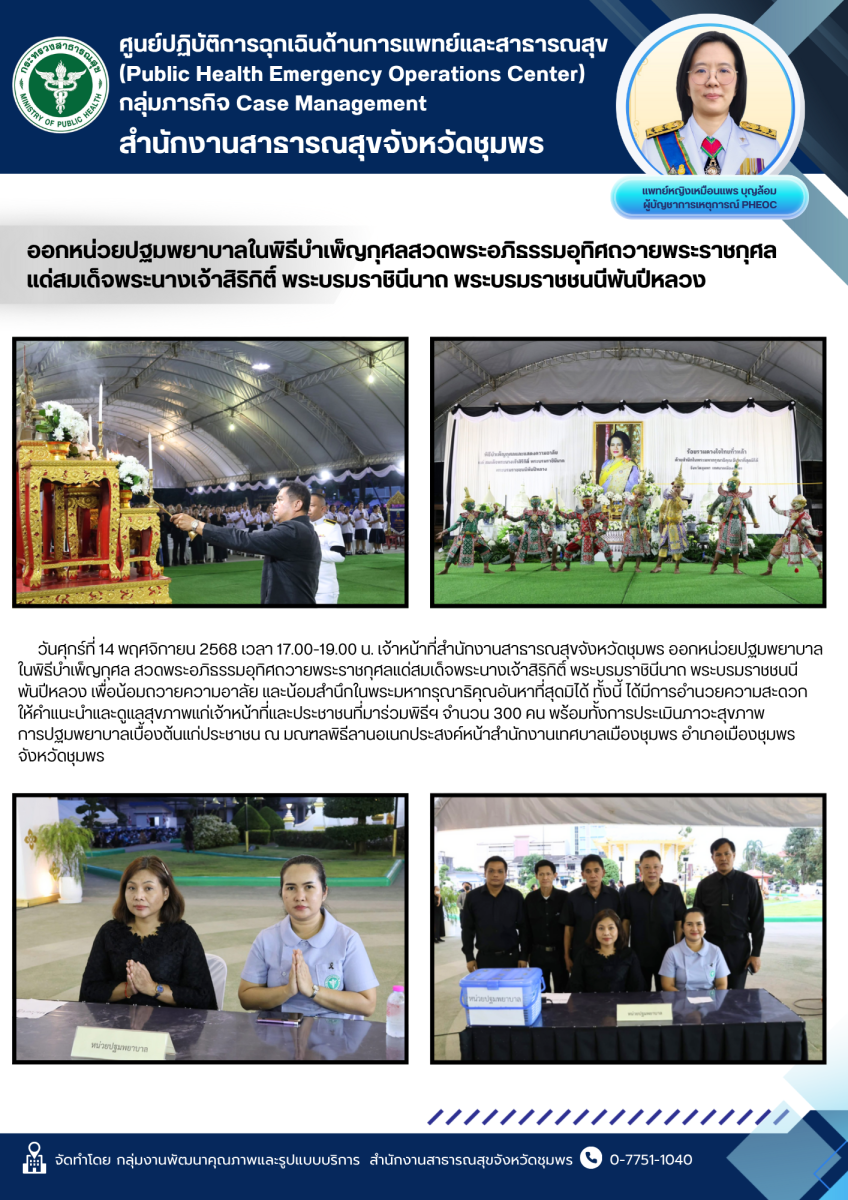 วันศุกร์ที่ 14 พฤศจิกายน 2568 เวลา 17.00-19.00 น. เจ้าหน้าที่สำนักงานสาธารณสุขจังหวัดชุมพร ออกหน่วยปฐมพยาบาลในพิธีบำเพ็ญกุศล สวดพระอภิธรรมอุทิศถวายพระราชกุศลแด่สมเด็จพระนางเจ้าสิริกิติ์ พระบรมราชินีนาถ พระบรมราชชนนีพันปีหลวง เพื่อน้อมถวายความอาลัย และน้อมสำนึกในพระมหากรุณาธิคุณอันหาที่สุดมิได้ ทั้งนี้ ได้มีการอำนวยความสะดวกให้คำแนะนำและดูแลสุขภาพแก่เจ้าหน้าที่และประชาชนที่มาร่วมพิธีฯ จำนวน 300 คน พร้อมทั้งการประเมินภาวะสุขภาพการปฐมพยาบาลเบื้องต้นแก่ประชาชน ณ มณฑลพิธีลานอเนกประสงค์หน้าสำนักงานเทศบาลเมืองชุมพร อำเภอเมืองชุมพร จังหวัดชุมพร