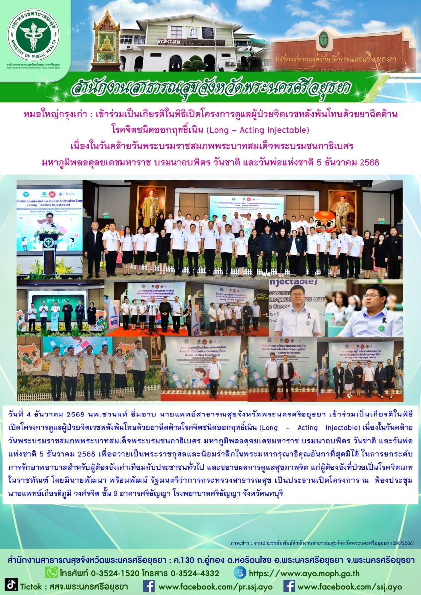 วันที่ 4 ธันวาคม 2568 นพ.ชวนนท์ อิ่มอาบ นายแพทย์สาธารณสุขจังหวัดพระนครศรีอยุธยา เข้าร่วมเป็นเกียรติในพิธีเปิดโครงการดูแลผู้ป่วยจิตเวชหลังพ้นโทษด้วยยาฉีดต้านโรคจิตชนิดออกฤทธิ์เนิน (Long - Acting Injectable) เนื่องในวันคล้ายวันพระบรมราชสมภพพระบาทสมเด็จพระบรมชนกาธิเบศร มหาภูมิพลอดุลยเดชมหาราช บรมนาถบพิตร วันชาติ และวันพ่อแห่งชาติ 5 ธันวาคม 2568 เพื่อถวายเป็นพระราชกุศลและน้อมรำลึกในพระมหากรุณาธิคุณอันกาที่สุดมิได้ ในการยกระดับการักษาพยาบาลสำหรับผู้ต้องขังเท่าเทียมกับประชาชนทั่วไป และขยายผลการดูแลสุขภาพจิต แก่ผู้ต้องขังที่ป่วยเป็นโรคจิตเภทในราชทัณฑ์ โดยมีนายพัฒนา พร้อมพัฒน์ รัฐมนตรีว่าการกระทรวงสาธารณสุข เป็นประธานเปิดโครงการ ณ ห้องประชุมนายแพทย์เกียรติภูมิ วงศ์รจิต ชั้น 9 อาคารศรีธัญญา โรงพยาบาลศรีธัญญา จังหวัดนทบุรี