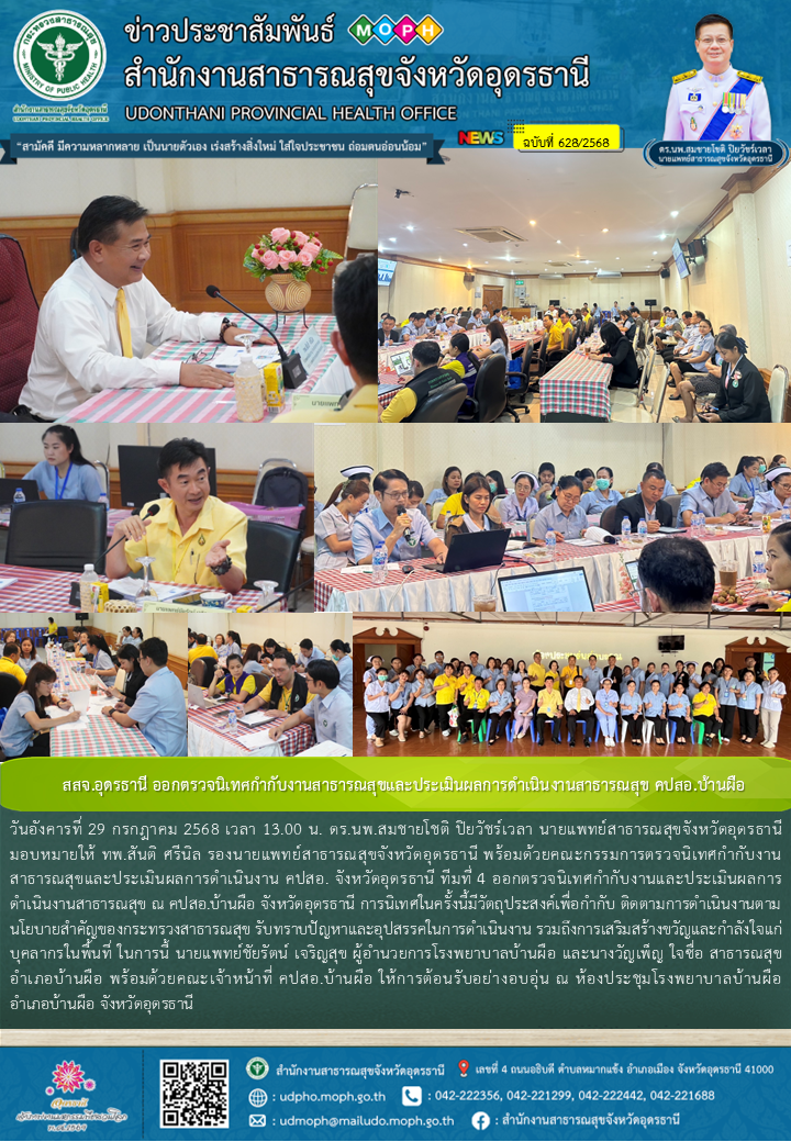 วันอังคารที่ 29 กรกฎาคม 2568 เวลา 13.00 น. ดร.นพ.สมชายโชติ ปิยวัชร์เวลา นายแพทย์สาธารณสุขจังหวัดอุดรธานี มอบหมายให้ ทพ.สันติ ศรีนิล รองนายแพทย์สาธารณสุขจังหวัดอุดรธานี พร้อมด้วยคณะกรรมการตรวจนิเทศกำกับงานสาธารณสุขและประเมินผลการดำเนินงาน คปสอ. จังหวัดอุดรธานี ทีมที่ 4 ออกตรวจนิเทศกำกับงานและประเมินผลการดำเนินงานสาธารณสุข ณ คปสอ.บ้านผือ จังหวัดอุดรธานี การนิเทศในครั้งนี้มีวัตถุประสงค์เพื่อกำกับ ติดตามการดำเนินงานตามนโยบายสำคัญของกระทรวงสาธารณสุข รับทราบปัญหาและอุปสรรคในการดำเนินงาน รวมถึงการเสริมสร้างขวัญและกำลังใจแก่บุคลากรในพื้นที่ ในการนี้ นายแพทย์ชัยรัตน์ เจริญสุข ผู้อำนวยการโรงพยาบาลบ้านผือ และนางวัญเพ็ญ ใจซื่อ สาธารณสุขอำเภอบ้านผือ พร้อมด้วยคณะเจ้าหน้าที่ คปสอ.บ้านผือ ให้การต้อนรับอย่างอบอุ่น ณ ห้องประชุมโรงพยาบาลบ้านผือ อำเภอบ้านผือ จังหวัดอุดรธานี