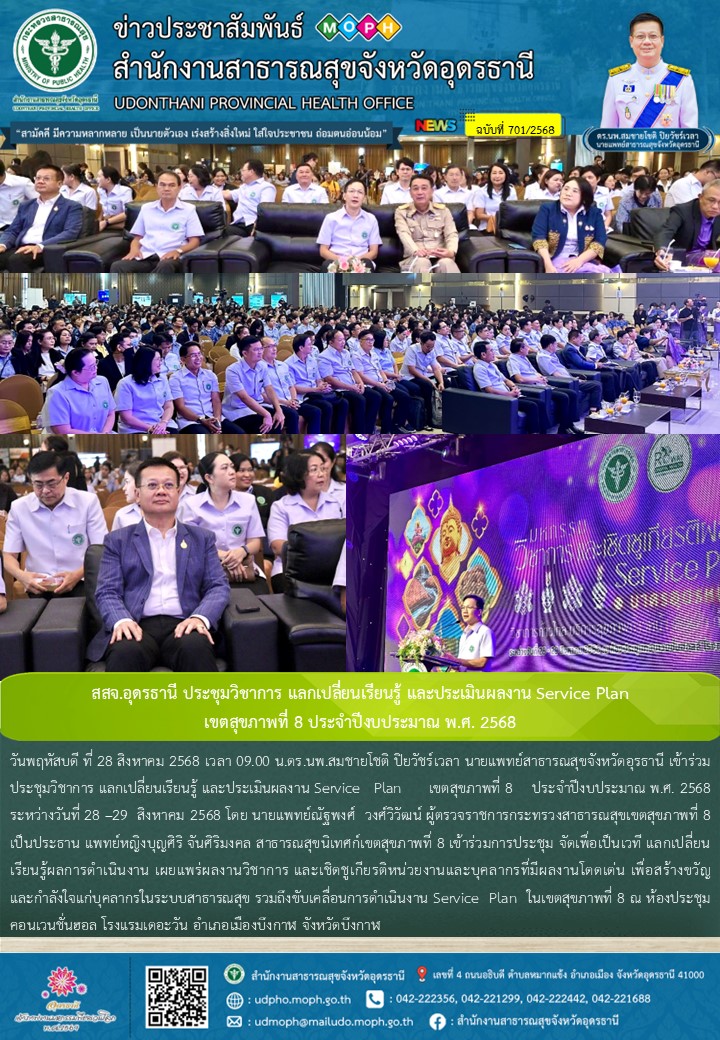 วันพฤหัสบดี ที่ 28 สิงหาคม 2568 เวลา 09.00 น.ดร.นพ.สมชายโชติ ปิยวัชร์เวลา นายแพทย์สาธารณสุขจังหวัดอุรธานี เข้าร่วมประชุมวิชาการ แลกเปลี่ยนเรียนรู้ และประเมินผลงาน Service Plan เขตสุขภาพที่ 8 ประจำปีงบประมาณ พ.ศ. 2568 ระหว่างวันที่ 28 –29 สิงหาคม 2568 โดย นายแพทย์ณัฐพงศ์ วงศ์วิวัฒน์ ผู้ตรวจราชการกระทรวงสาธารณสุขเขตสุขภาพที่ 8 เป็นประธาน แพทย์หญิงบุญศิริ จันศิริมงคล สาธารณสุขนิเทศก์เขตสุขภาพที่ 8 เข้าร่วมการประชุม จัดเพื่อเป็นเวที แลกเปลี่ยนเรียนรู้ผลการดำเนินงาน เผยแพร่ผลงานวิชาการ และเชิดชูเกียรติหน่วยงานและบุคลากรที่มีผลงานโดดเด่น เพื่อสร้างขวัญ และกำลังใจแก่บุคลากรในระบบสาธารณสุข รวมถึงขับเคลื่อนการดำเนินงาน Service Plan ในเขตสุขภาพที่ 8 ณ ห้องประชุม คอนเวนชั่นฮอล โรงแรมเดอะวัน อำเภอเมืองบึงกาฬ จังหวัดบึงกาฬ