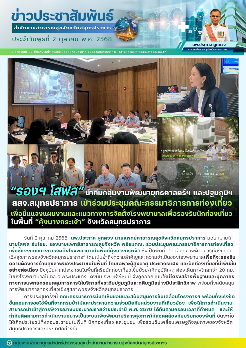 สสจ.สมุทรปราการ เข้าร่วมประชุมคณะกรรมาธิการการท่องเที่ยวเพื่อชี้แจงแผนงานและแนวทางการจัดตั้งโรงพยาบาลเพื่อรองรับนักท่องเที่ยวในพื้นที่ "คุ้มบางกระเจ้า" จังหวัดสมุทรปราการ