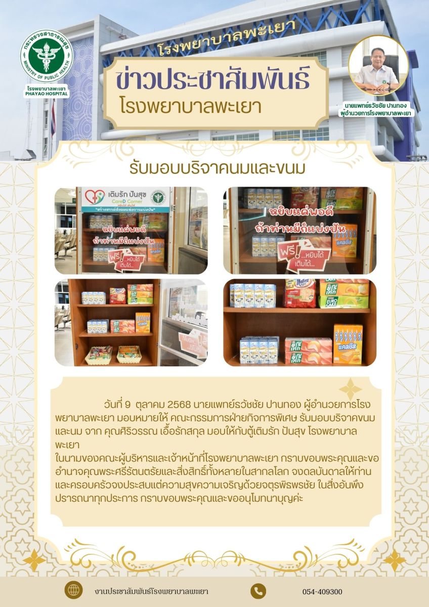 วันที่ 9 ตุลาคม 2568 นายแพทย์ธวัชชัย ปานทอง ผู้อำนวยการโรงพยาบาลพะเยา มอบหมายให้ คณะกรรมการฝ่ายกิจการพิเศษ รับมอบบริจาคขนมและนม จาก คุณศิริวรรณ เอื้อรักสกุล มอบให้กับตู้เติมรัก ปันสุข โรงพยาบาลพะเยา