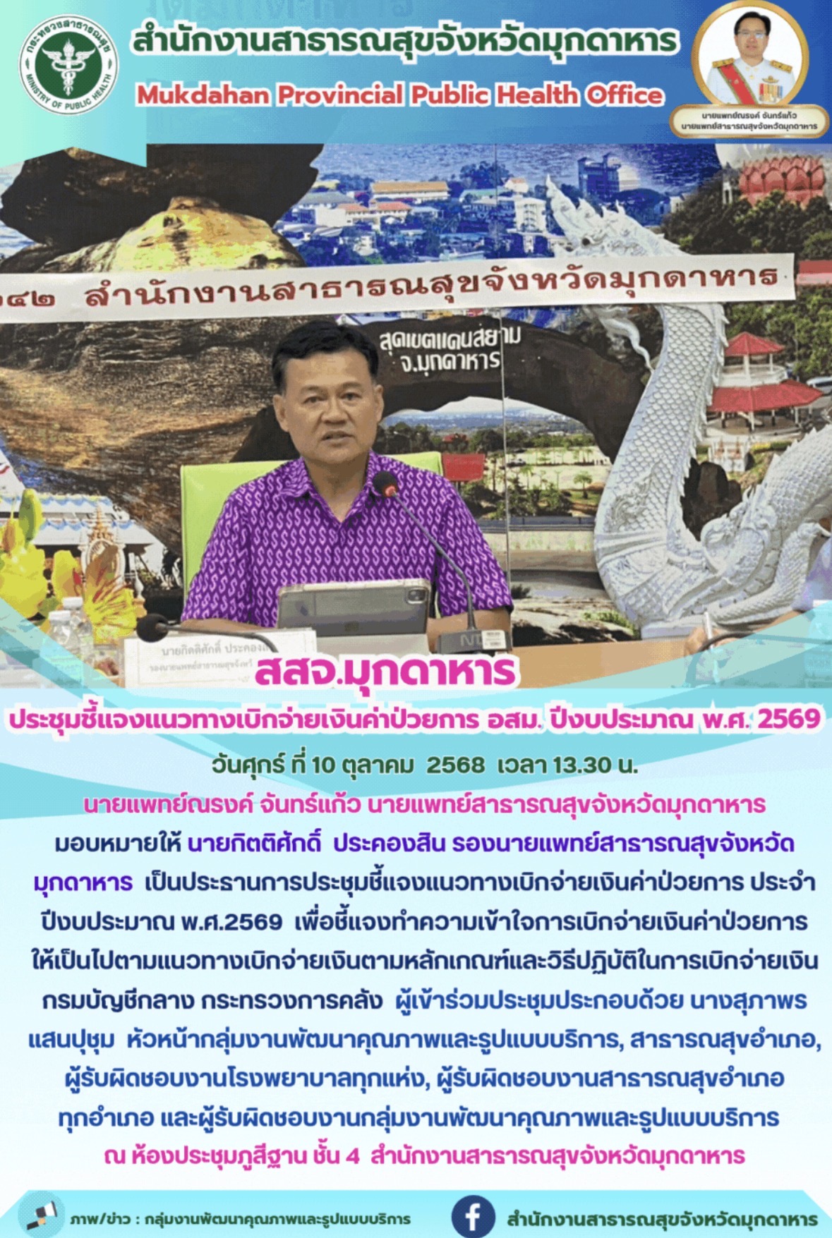 วันศุกร์ ที่ 10 ตุลาคม 2568 เวลา 13.30 น. นายแพทย์ณรงค์ จันทร์แก้ว นายแพทย์สาธารณสุขจังหวัดมุกดาหาร